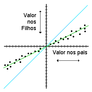 No gráfico acima esá representada a relação entre pais e filhos de uma variável métrica (por exemplo, altura). A linha azul representa o esperado se os filhos tivessem exatamente o valor da média dos pais. Note que pais que apresentam valores maiores da característica têm descendência com um valor médio da característica menor que a média observada daquela medida entre os pais. Por outro lado, os pais que tem o valor menor da característica têm os filhos com valores maiores que aquele da mádia entre os pais. Por isso a lei foi chamada de "regressão para a média". Como curiosidade, o método estatístico de ajuste de linhas pelo método dos mínimos quadrados é até hoje chamado de "regressão linear" por um dos seguidores de Galton, Pearson. O índice r que mostra quão bem os pontos experimentais se ajustam a uma reta é o coeficiente de regressão linear de Pearson.